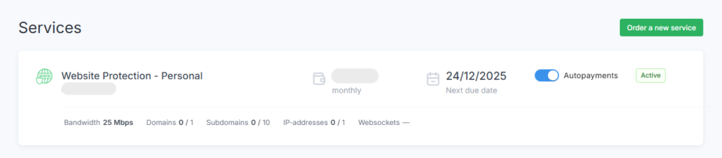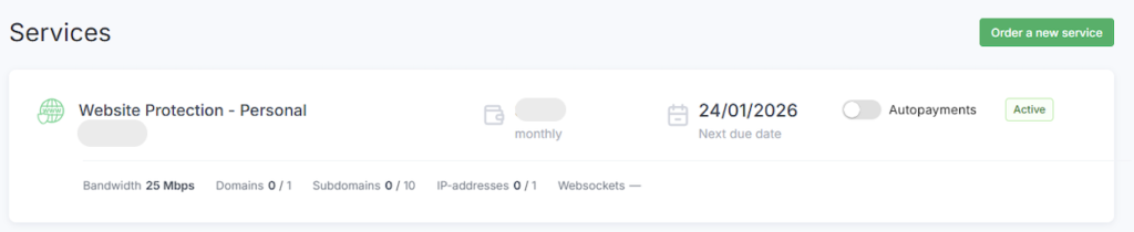 To disable recurring payments for a single service, navigate to the Dashboard tab and set the Autopayments toggle to the OFF position.