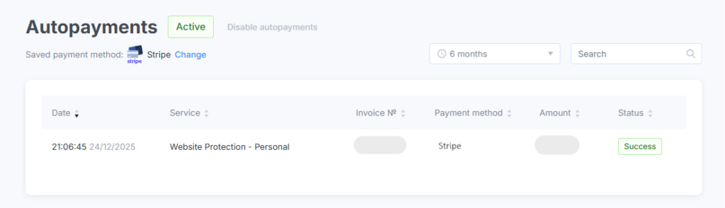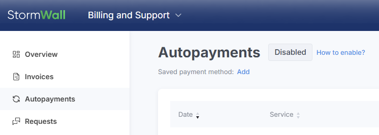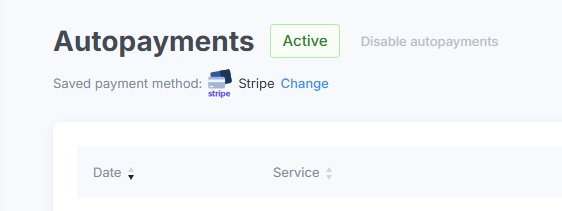 Specify the payment method by clicking the Add button in the Saved Payment Method row, or the Change button if a method has been previously selected. Alternatively, you can make a manual one-time payment for the service (in the Invoices section) — the system will then automatically save your choice.