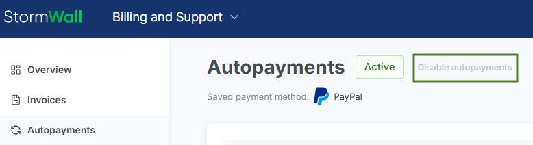 In the Billing and Support section, select Autopayments from the main menu. On the page that opens, click the Disable фutopayments button.