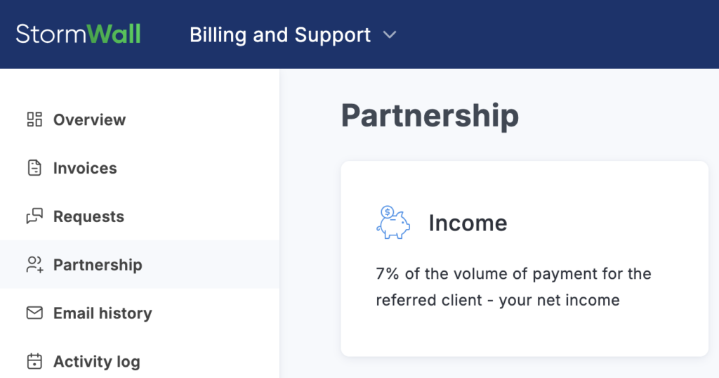 In the top menu bar, navigate to the Billing and support tab. In the menu that opens on the left, select the Partnership option.