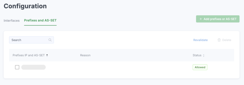 To add a new value, click the Add Prefixes or AS-SET button and fill out the form that appears. Select values by checking their boxes to use the Revalidate or Delete button.
