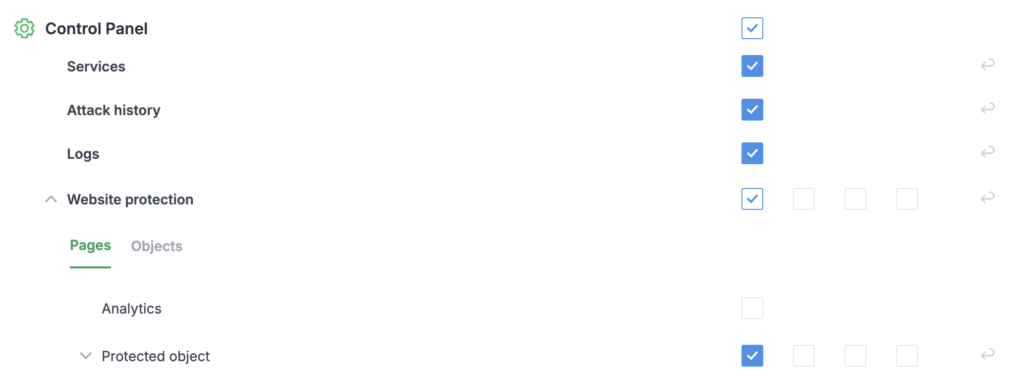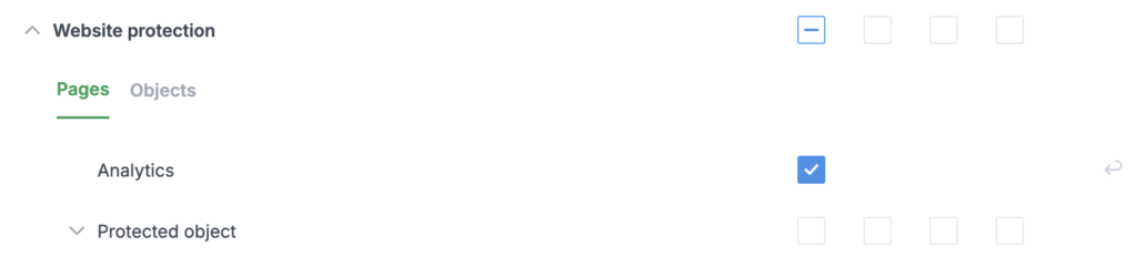 If access to a section is restricted but access to one of its subsections is allowed, the checkbox in the section row (for example, Website protection) will be replaced with a “minus” sign. The permission set at the higher level takes precedence over those set at lower levels.