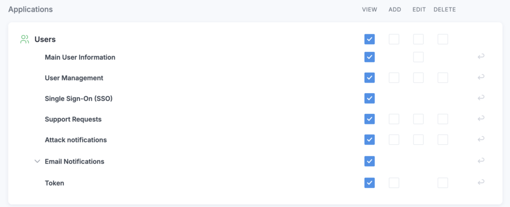 If you deny access to one of the subsections (for example, Analytics), the checkbox in the row with the section name (for example, Dashboard) will change color. This indicates that the user will have general access to the section, but not to all of its subsections.