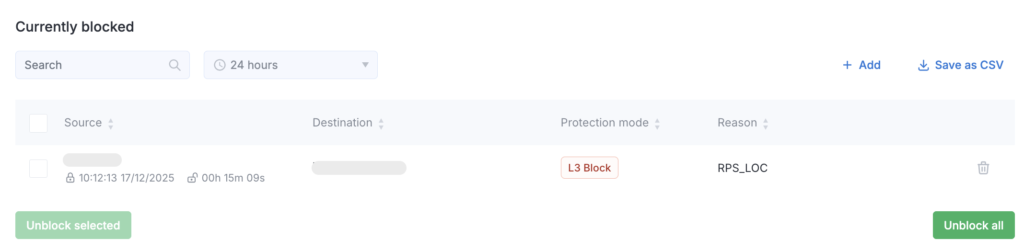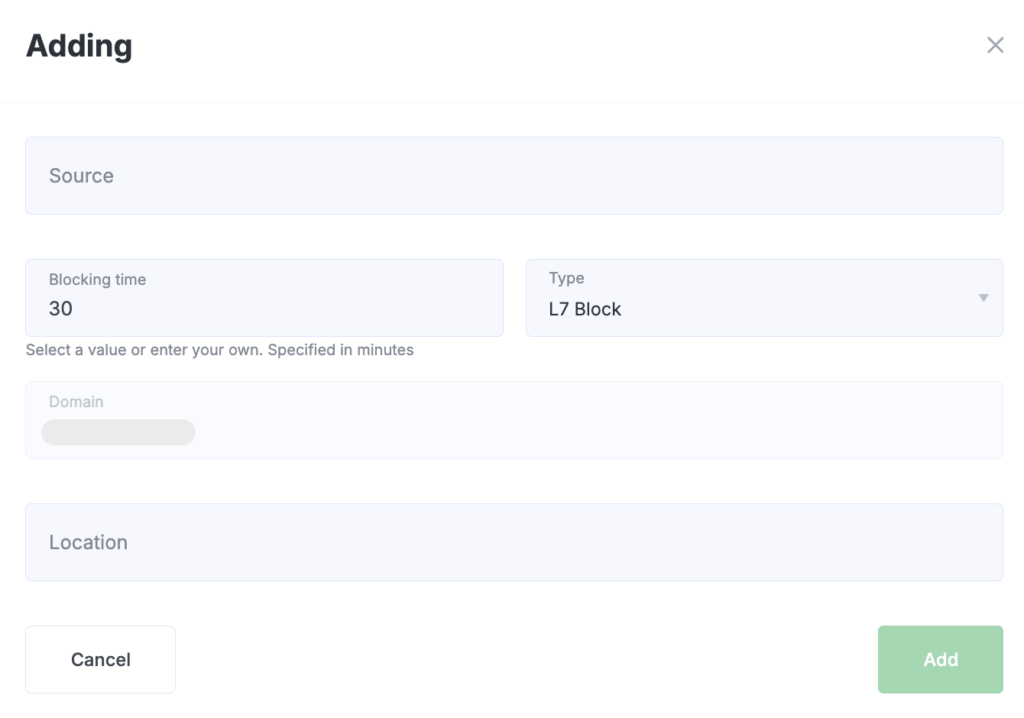 - Location – the relative path (without parameters) for which the IP address will be blocked. If no URL is specified, the action applies to the entire domain.