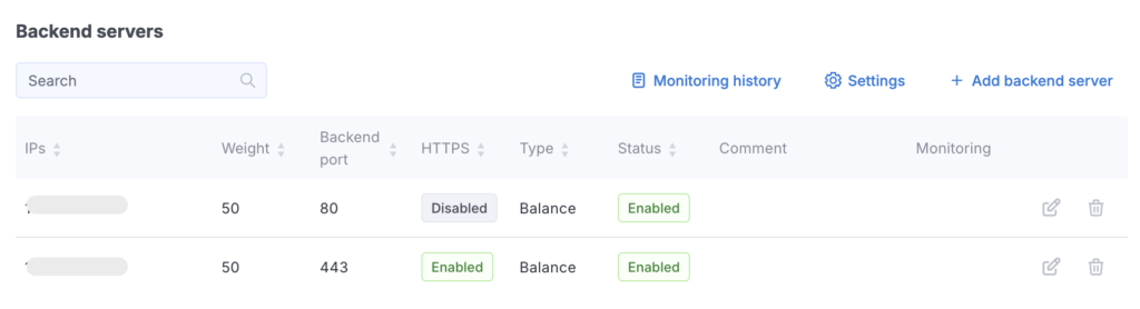 Added objects will appear in the table. Using the buttons on the right side of each row, you can modify or delete a backend server.
