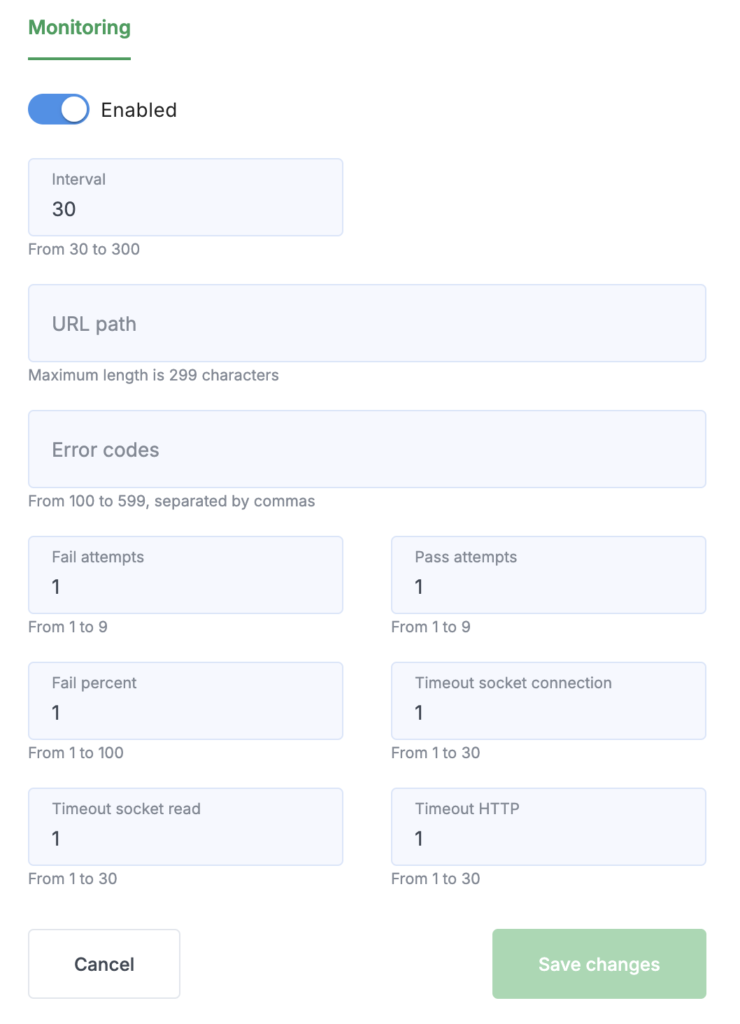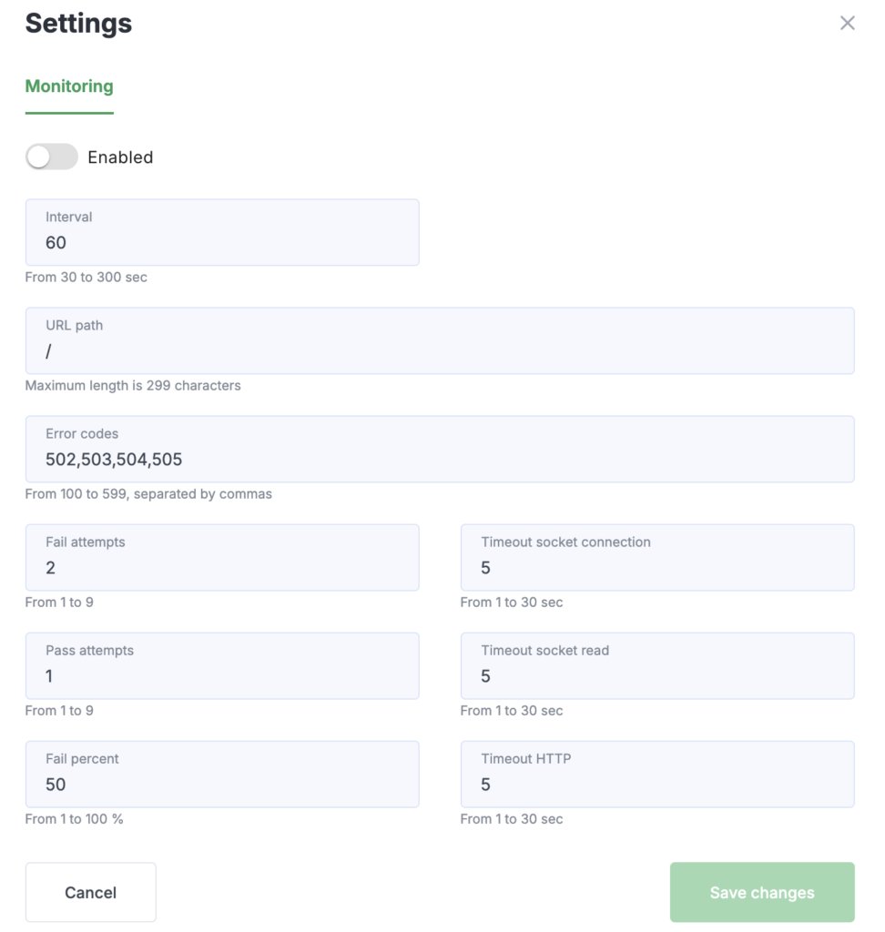In the window that opens, you can use the toggle to enable or disable monitoring for backends, as well as configure the following parameters: